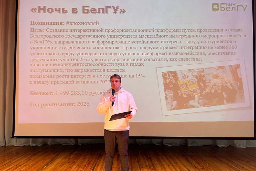 В НИУ «БелГУ» состоялась презентация проектных идей для участия в конкурсе «Росмолодёжь.Гранты». Студенты институтов, представители студенческих объединений, а также специалисты по спорту, культуре и науке представили свои инициативы, направленные на развитие университета и региона.