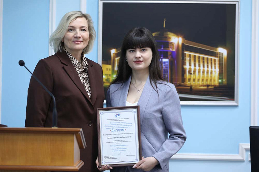 Приятным моментом церемонии открытия стало вручение наград. От имени Уполномоченного по правам человека в Российской Федерации Татьяны Москальковой Жанна Киреева вручила дипломы победителям всероссийского конкурса «Инновационные технологии в правовом просвещении по вопросам прав и свобод граждан: формы, методы и защита». В номинации «Лучший видеоролик о правах человека» первое место заняла ассистент кафедры теории и истории государства и права НИУ «БелГУ» Виктория Нестеренко. А в номинации «Лучшая интерактивная обучающая программа на тему: «Права человека, формы и методы их защиты» для образовательных организаций победу одержала заведующая кафедрой конституционного и международного права юридического института НИУ «БелГУ» профессор Марина Мархгейм.