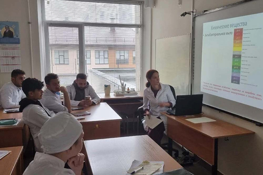 На кафедре микробиологии и вирусологии с курсом клинической иммунологии перед третьекурсниками с лекцией «Микробиом кожи» выступила старший преподаватель кафедры Ольга Шевченко. Мероприятие, прошедшее под руководством заведующей кафедрой, доктора медицинских наук Ксении Бочаровой, познакомило будущих врачей с современными представлениями о микробиоме кожи, его роли в поддержании здоровья и участии в патологических процессах. Лекция позволила не только углубить знания в области медицинской микробиологии, но и сформировать клиническое понимание значимости микробиома для повседневной врачебной практики. Завершилось занятие практическим шагом – был проведён отбор студентов, изъявивших желание принять участие в исследовании микробиома кишечника.